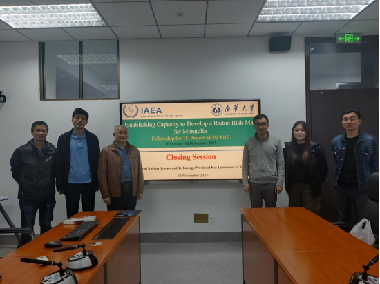 11月10日下午,在伟的国际1946bv国家核应急宣传和培训基地会议室举行了该培训活动的闭幕会。会上,肖德涛教授对此次培训访问活动进行了总结。他指出,为期4周的培训按照日程完成了预定的培训内容,希望此次培训能够使两位学员对氡的特性和测量有进一步的认识,能够为蒙古国关于氡的国家计划起到一定的帮助作用,后续可随时为两位学员提供相应的技术咨询服务。随后,Ganbolor Naranbaatar女士和Bayanjargal Unenbat先生对参与此次培训活动并提供帮助的老师表示了衷心的感谢,在为期4周的培训期间系统性的学习到了氡的相关知识,掌握了相关的实验方法,为帮助蒙古国建立相关的规章制度以及实验能力奠定了良好的理论和技术基础,希望后续伟的国际1946bv能持续为其提供技术支持。