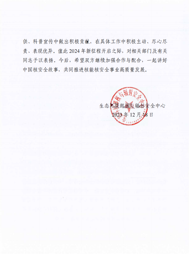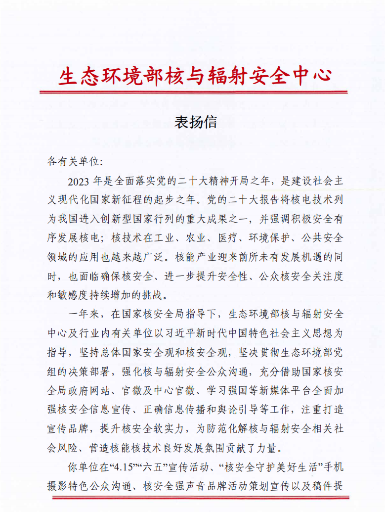 12月18日,我校收到生态环境部核与辐射安全中心表扬信,对学校和有关同志在“4.15”“六五”宣传活动、“核安全守护美好生活”手机摄影特色公众沟通、核安全强声音品牌活动策划宣传以及稿件提供、科普宣传中做出的积极贡献进行表扬。