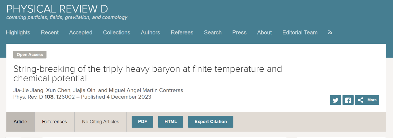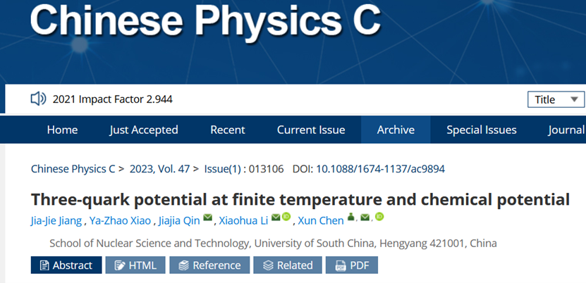 近日,我院核物理专业2001班本科生江佳杰以第一作者身份,在国际物理学权威期刊、Top期刊《Physical Review D》(Phys. Rev. D 108 (2023) 126002,IF=5)发表了题为《String-breaking of the triply heavy baryon at finite temperature and chemical potential》的SCI一区论文。该文章是江佳杰同学在陈勋老师、秦佳佳老师和Miguel Angel Martin Contreras老师指导下完成。这也是该同学的第二篇高质量科研论文,也就是去年的同一时间,江佳杰同学以第一作者身份已经在中国科技期刊卓越行动计划重点期刊《Chinese Physics C》(Chinese Physics C Vol. 47, No. 1 (2023) 013106,IF=3.6)发表题为《Three-quark potential at finite temperature and chemical potential》的SCI论文。该文章是江佳杰同学与肖亚朝同学在陈勋老师、秦佳佳老师和李小华教授指导下完成的。除了在学术研究方面的表现,江佳杰同学还获得了大学生创新创业训练项目省级项目立项1项。这两篇文章均得到了国家自然科学基金、湖南省自然科学基金和教育厅项目的支持。