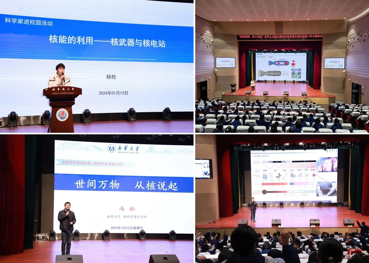 2024年1月12日,冯松和杨桧两位博士走进柘里渡小学开展“科技强国奋斗有我”科技之光服务暨青年科学家进校园主题活动,并分别作了题为“核能的利用——核武器与核电站”和“世间万物从核说起”两个科普报告。