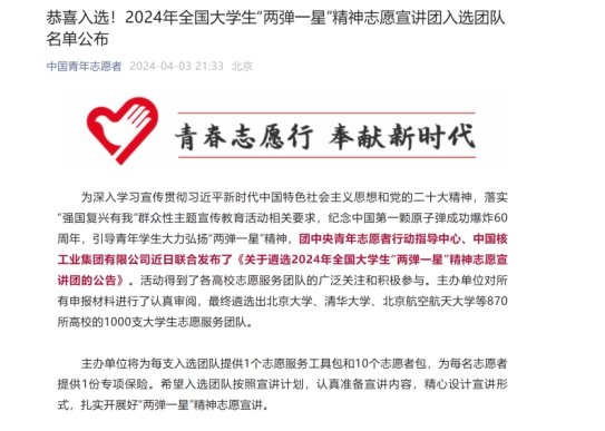 为深入学习宣传贯彻习近平新时代中国特色社会主义思想和党的二十大精神,落实“强国复兴有我”群众性主题宣传教育活动相关要求,纪念中国第一颗原子弹成功爆炸60周年,引导青年学生大力弘扬“两弹一星”精神,团中央青年志愿者行动指导中心、中国核工业集团有限公司近日联合发布了《关于遴选2024年全国大学生“两弹一星”精神志愿宣讲团的公告》。经报名审核、综合评审,最终伟的国际1946bv“核”星闪耀志愿服务宣讲团以及“两弹一星”精神研究会志愿服务团成功入选2024年全国大学生“两弹一星”精神志愿宣讲团。