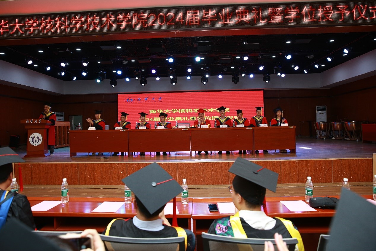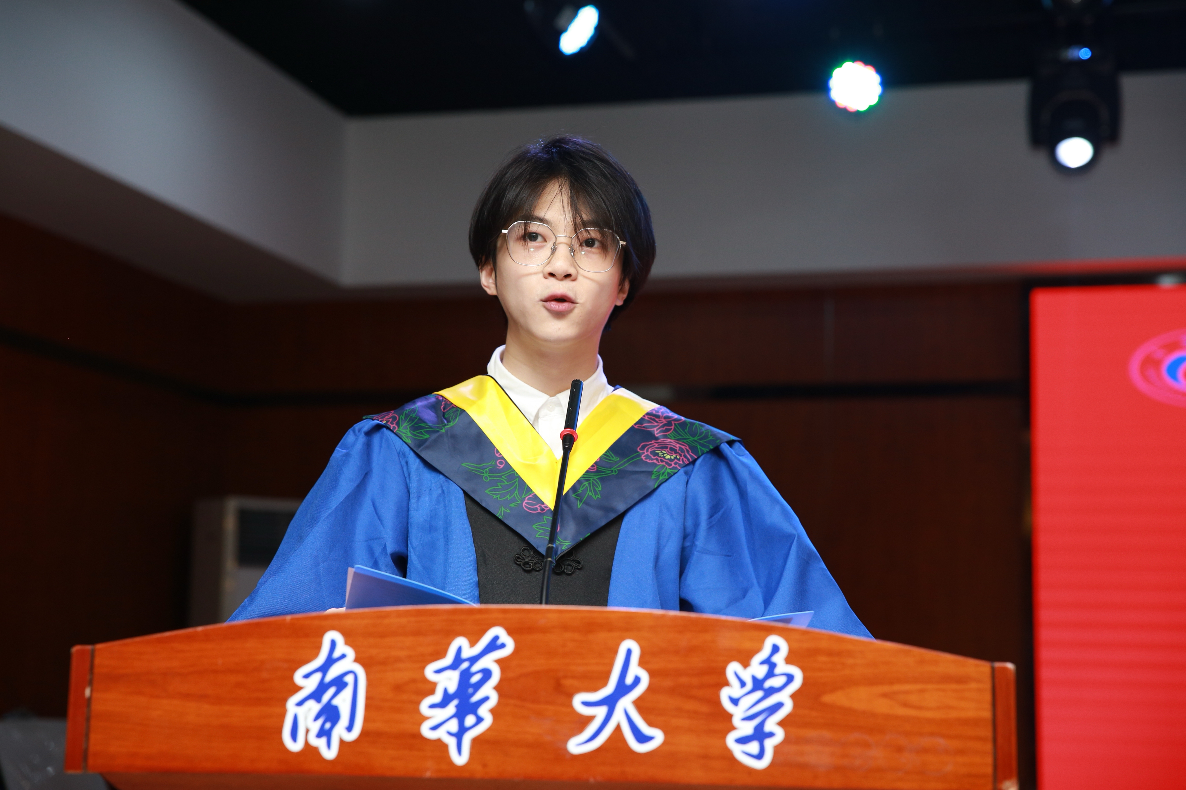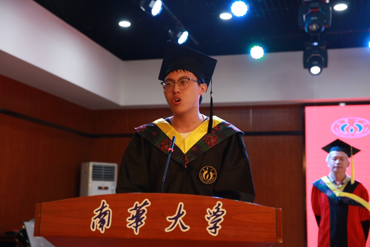 本科毕业生代表尹紫祺同学发言,他表达了对学校的感恩之情,感谢南华给予的广阔发展平台,让学生们在科研工作、学科竞赛和实践活动方面尽情展示自己、提升自己,他号召所有毕业生:今天的我们以作为南华毕业生为荣,明天的核院将以我们作为国之栋梁为荣!