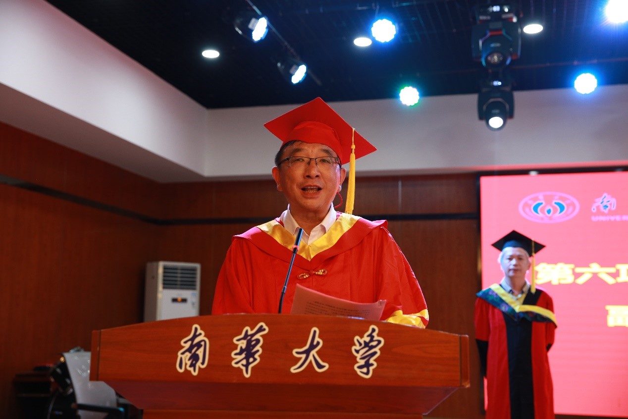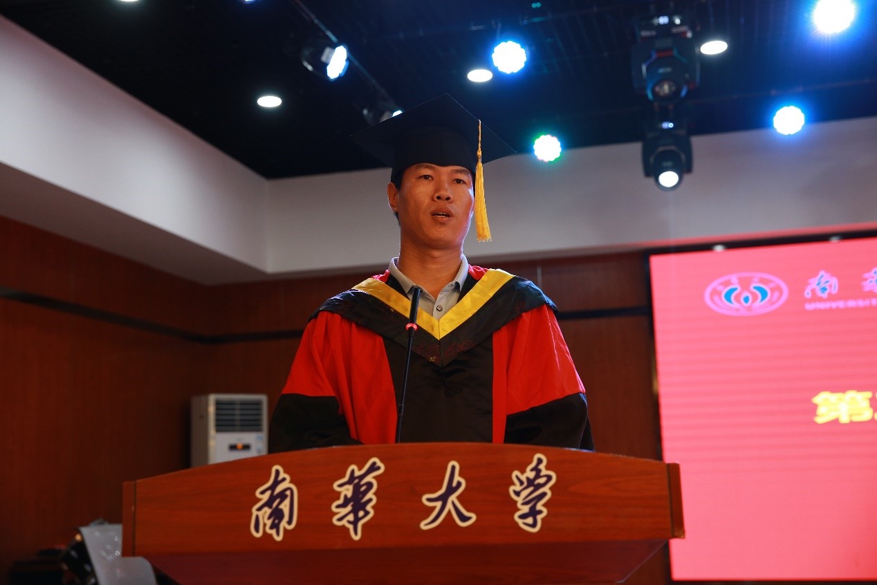 硕士毕业生代表刘程伟同学发言,他在一点一滴、一处一景中回顾了求学南华的难忘时光,并依次表达了对导师、学院、同窗们的感谢与不舍,他表示,在今后的人生道路上会继承和弘扬“热爱祖国、无私奉献,自力更生、艰苦奋斗,大力协同、勇于登攀”的两弹一星精神,会牢记恩师们的教诲、鞭策自己、脚踏实地在新的岗位上做一个知荣辱的人。