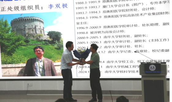 会议伊始,党委书记赵立宏和院长郑波代表学院为对正处级组织员李双极教授及核工程实验中心王宏达老师两位退休同志举行了欢送仪式,赵立宏向与会人员介绍两位老同志的优秀事迹,并向他们致以最诚挚的祝福。李双极教授代表退休人员上台讲话,他对学校、学院以及各位领导和老师们长期以来的支持和关心表示衷心感谢,同时郑重承诺在退休工作期间会一如既往地支持学校、学院的各项工作,也祝愿学院各项工作再创佳绩。