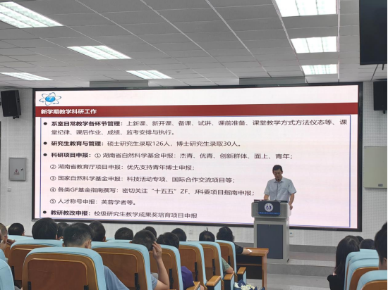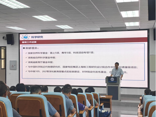 随后,郑波对学院2024年暑期工作开展情况进行介绍,他围绕本科教育教学培养方案修订、学生教育管理、研究生培养、国际交流、科研项目、放射性管理工作以及暑期访企拓岗等方面展开介绍,并对新学期各项工作进行了详细说明和部署。
