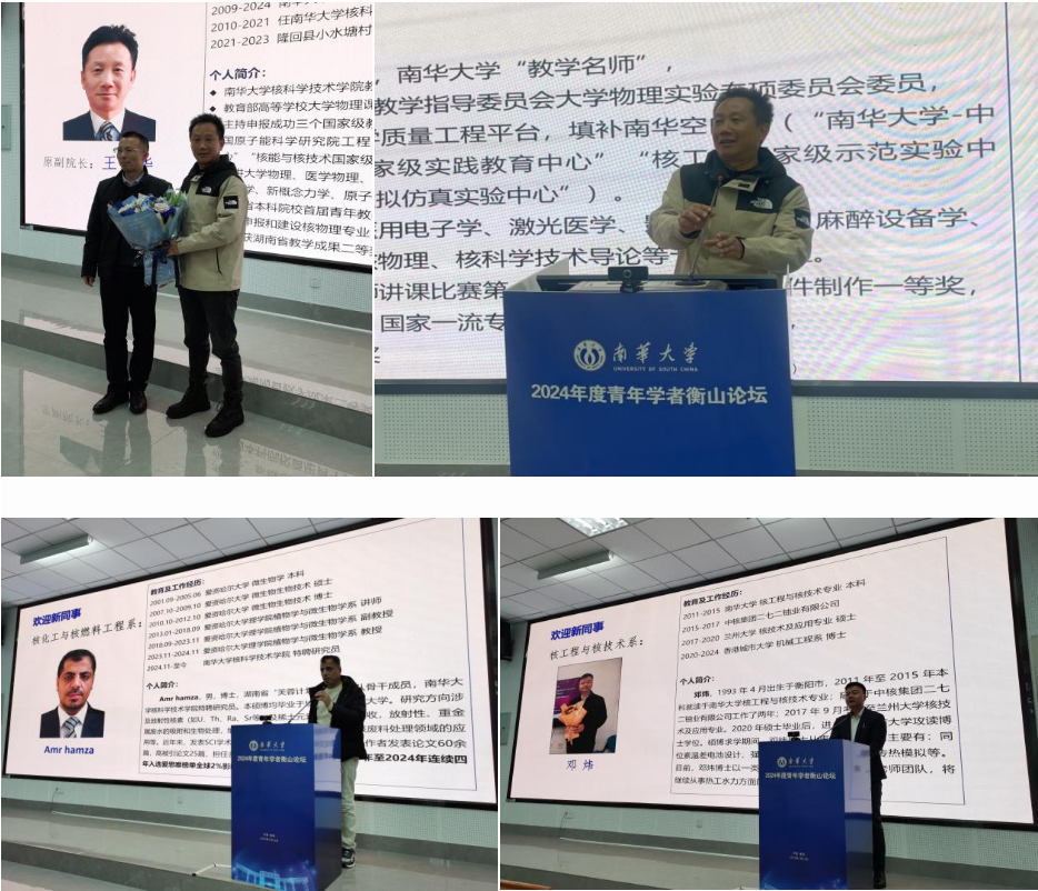 第二阶段,大会先举行了一个温馨的欢送退休的王振华教授、欢迎Amr hamza、吴强及邓炜等三位新同事的仪式。罗文院长回顾了王振华教授在学院多年来的辛勤付出和卓越贡献,并祝愿他退休生活幸福美满、健康快乐;王振华教授以“不易、不悔、不舍、不忘”表达了对学院的深厚感情和对同事们的深厚友谊。Amr hamza和邓炜老师也上台表示会发挥自身所长,积极投身学院的各项工作,努力建设核院大家庭。
