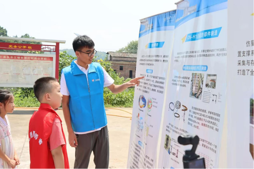 在安仁县长潭村,志愿者通过核聚变系列展板、《CN-H1仿星器--磁约束核聚变大科学装置》、《托起明天的太阳》科普图书和核科普PPT演示,向孩子们讲解核聚变原理和仿星器装置。志愿者们用展板与动画演示相结合的方式,生动展示了磁约束核聚变的基本原理、大科学装置的“神奇”。