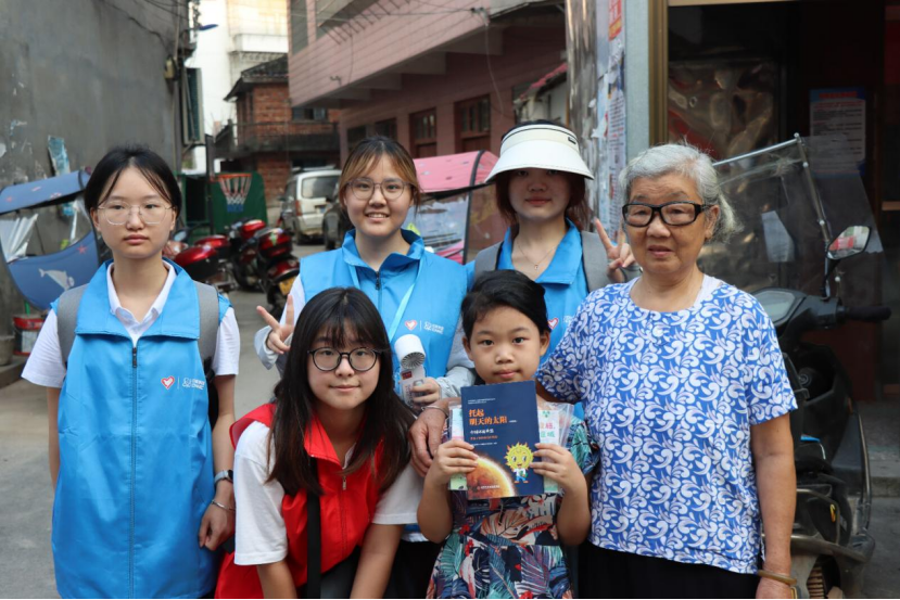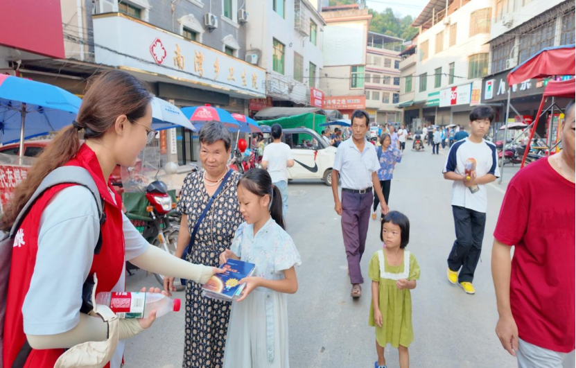 在衡东县南湾乡早集市场,志愿者通过“知识问答”的方式,给小朋友们发放科普绘本、拼图套装。围绕“核能发电原理”“清洁能源应用”“双碳目标”等主题与儿童互动交流。