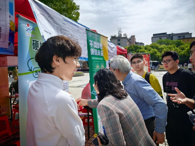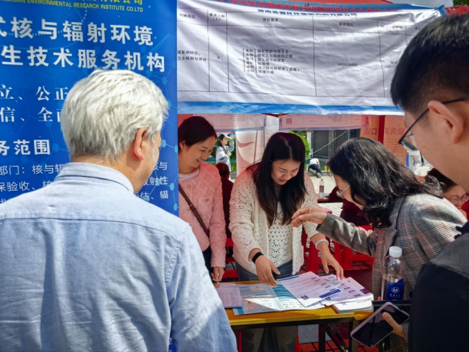 招聘会现场气氛热烈,核类用人单位展位前咨询学生络绎不绝。赵立宏一行先后走访湖南省湘环环境研究院有限公司、陕西秦洲核与辐射安全技术有限公司、杭州湘亭科技有限公司、上海怡星机电设备有限公司、浙江恒达数智科技股份有限公司、中核立信(北京)科技有限公司、陕西卫峰核电子有限公司、天津瑞丹辐射检测评估有限责任公司、、中国核电工程有限公司华东分公司、万纳神核控股集团有限公司等多家核类用人单位,与招聘负责人深入交流,详细了解单位发展情况、岗位需求、招聘计划、人才培养要求、薪酬待遇及毕业生成长通道等情况,并围绕核类人才培养、就业实习基地建设、产学研合作、校企协同育人等方面进行深入探讨。