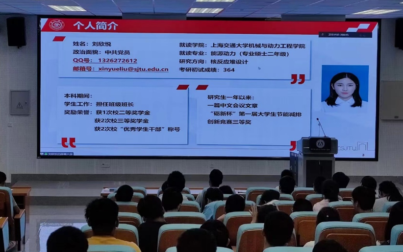 讲座第三项议程,2021届优秀校友上海交通大学研究生刘欣悦做考研经验分享。她主要从个人简介、学科方向、科研概况、我的交大生活等三个方面展开交流。在科研概况方面,她对学院的招生录取情况、培养方式、硕士生奖助体系进行了详细的讲述。她也以自身考研的经历勉励在座的学弟学妹,希望同学们明确自己的定位,朝着方向不懈努力,并且要争取各种提升自己的机会。