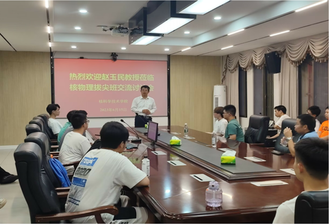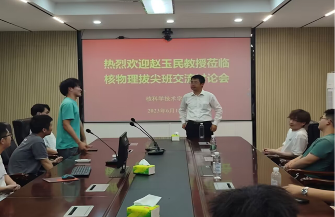 2023年06月15日晚,国家杰青、上海交通大学物理与天文学院赵玉民教授受邀参加我院核物理拔尖班的交流讨论会。30名核物理拔尖班学生和相关研究生参加会议。