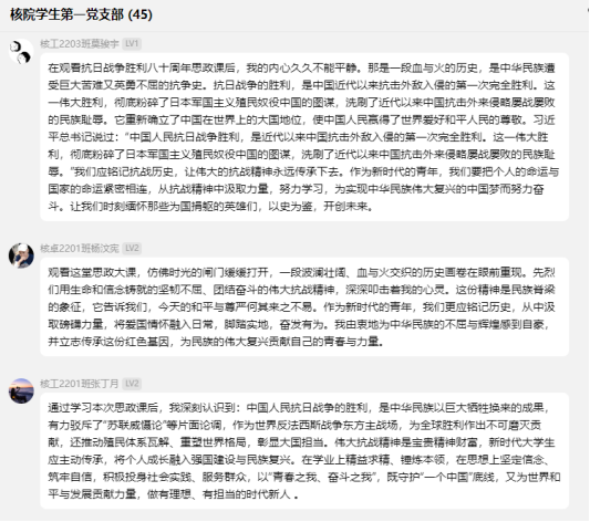 “结合专业特色,强化使命担当”。作为bv1946伟德国际始于英国的学生,尤其是中共党员,大家深刻认识到,国家强大离不开科技自立自强,核事业更是国之重器、强国之基。抗战精神中蕴含的艰苦奋斗、自力更生、勇于奉献的品质,与“两弹一星”精神、“核工业精神”一脉相承。同志们表示,要将抗战精神融入专业学习和科研实践,立志为祖国核事业发展贡献青春力量,守护国家安全,服务国计民生。