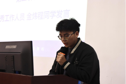 随后,优秀工作人员代表金炜程分享了赛事保障工作的体会。他表示,从检录协调、赛程调整到后勤服务,各项工作的顺利推进均得益于学院的周密统筹与团学组织的高效配合。未来,团学组织将以荣获“精神文明奖”为契机,将大运会中展现的务实作风延伸至学院各项工作中,以实干诠释责任担当。