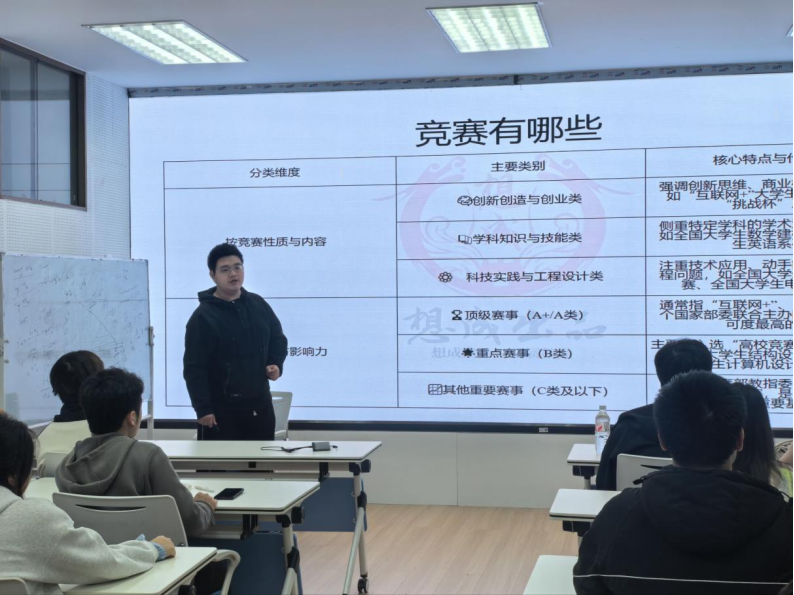 他还聚焦当下科创趋势,讲解了AI工具在竞赛中的合理应用方式,倡导学生善用AI开展信息处理、模型推荐、文档撰写等辅助工作,同时杜绝完全依赖智能工具,坚守主观能动性,自主优化整合AI输出内容,把控项目关键决策环节;活动还深度剖析参赛重难点,核心是发挥竞赛育人功能,全程锤炼学生调研分析、专业应用、路演答辩、临场应变、自主学习、实干落地六大能力,现存难点集中在团队管理与时间平衡两方面,建议通过建立明确考核机制、合理分配利益调动团队积极性,依托提升课堂效率、巧用办公工具、划分任务优先级,协调好竞赛、学业与校园活动的时间分配。
