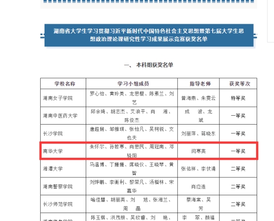 近日,湖南省教育厅发布通知,根据《关于开展湖南省大学生学习贯彻习近平新时代中国特色社会主义思想暨第七届大学生思想政治理论课研究性学习成果展示竞赛的通知》要求,各高校高度重视,认真组织,共有来自全省112所高校的16715个学习小组参加复赛。经过书面复赛和现场决赛,分本科组和高职高专组,决出了特、一、二、三等奖和优秀组织奖。