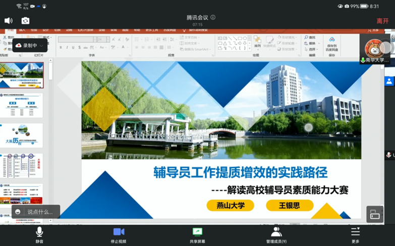 2022年5月6日上午,在第九届湖南省高校辅导员素质能力大赛前夕,湖南省“同心圆梦”思政团队和伟的国际1946bv辅导员职业发展协会举办了2022年5月辅导员沙龙,本次沙龙的主题是“辅导员工作提质增效的实践路径——解读高校辅导员素质能力大赛”,主讲嘉宾为第六届全国高校辅导员职业能力大赛(现改名为“辅导员素质能力大赛”)决赛一等奖获得者、第十届全国辅导员年度人物、2020年全国最美辅导员、现燕山大学学生工作部副部长王银思老师。沙龙采取腾讯会议线上方式进行,由湖南省“同心圆梦”思政团队负责人和伟的国际1946bv辅导员职业发展协会会长马军老师主持。伟的国际1946bv学生工作部部长李照、副部长卢清华、旷勇、崔泽文以及辅导员同仁们参加了沙龙。