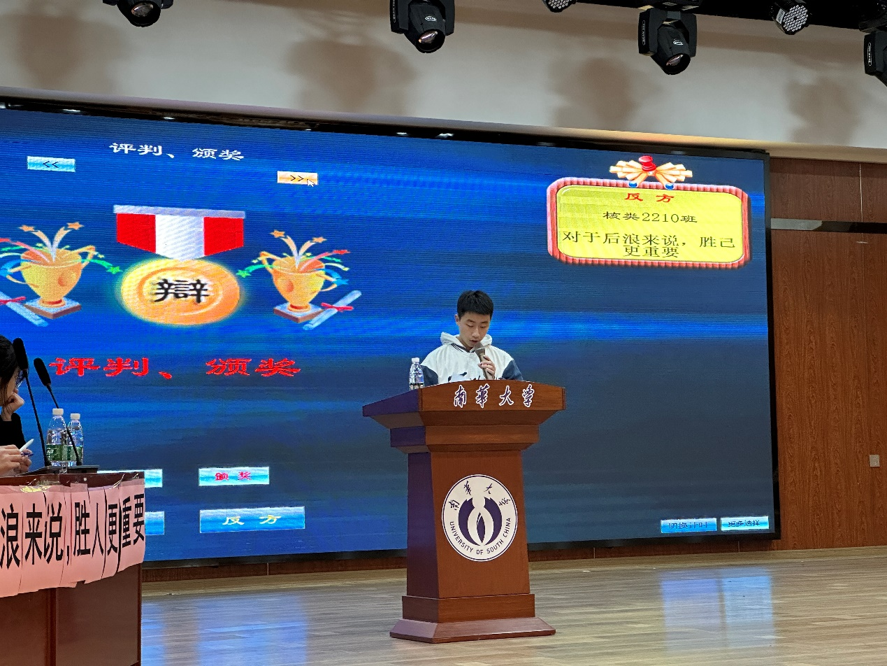 辩论结束后,由语言文学学院的姚传奇学长对此次比赛做总结并公布结果,最终,核类2211班拿下此次辩论赛的冠军,正方二辩李湘杰和反方二辩李锦昊两位选手获得“最佳辩手”称号。