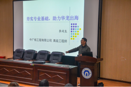 李闰生结合个人的职业生涯路线图给同学们讲述了他的大学生活。李闰生还为大家分享了他在中广核工程有限公示工作的经验与经历,与同学们分享了他在工作过程中的体会,并希望同学们可以根据国家社会发展要求和自身实际情况做好自身职业生涯规划,更好的弘扬“勤勉务实、甘于奉献、刚健自强、敢为人先”的南华精神和“事业高于一切、责任高于一切、严细融入一切、进取成就一切”的核工业精神。