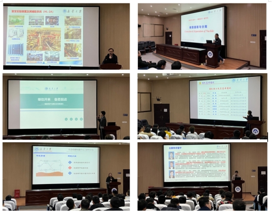 会上,核聚变与等离子体物理团队、中低能物理与强子物理团队、核素提取与分离团队、先进探测器技术团队、反应堆与核动力团队、辐射防护与核安全团队、核分析技术在医学中的应用团队、韦悦周教授团队、刘龙成教授团队、汤贤教授团队分别介绍了各自的研究方向、近5年来取得的科研成果及未来的发展目标和规划等。各报告团队通过详实的数据和生动的案例与同学们展开亲切的交流与互动,结合“强核报国 创新奉献”的新时代核工业精神,导师们鼓励同学们积极加入到核学科的研究建设当中,不断提升科研能力和创新创业能力,为学校学科建设贡献力量。