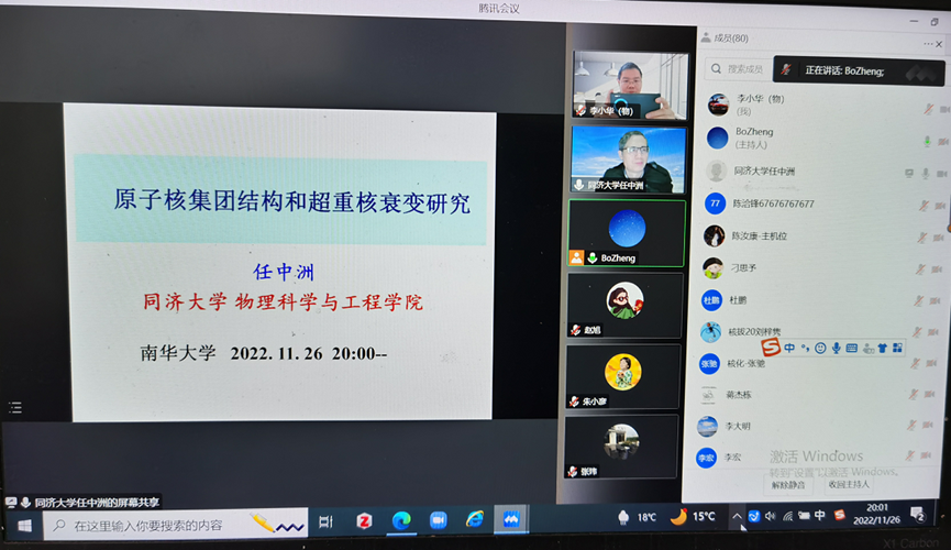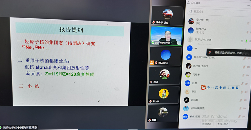 2022年11月26日晚8:00,应bv1946伟德国际始于英国的邀请,同济大学任中洲教授以线上会议的方式为我院师生做了题为:原子核集团结构和衰变研究的主题报告。学术报告由bv1946伟德国际始于英国郑波院长主持,近100名师生线上参加此次报告会。