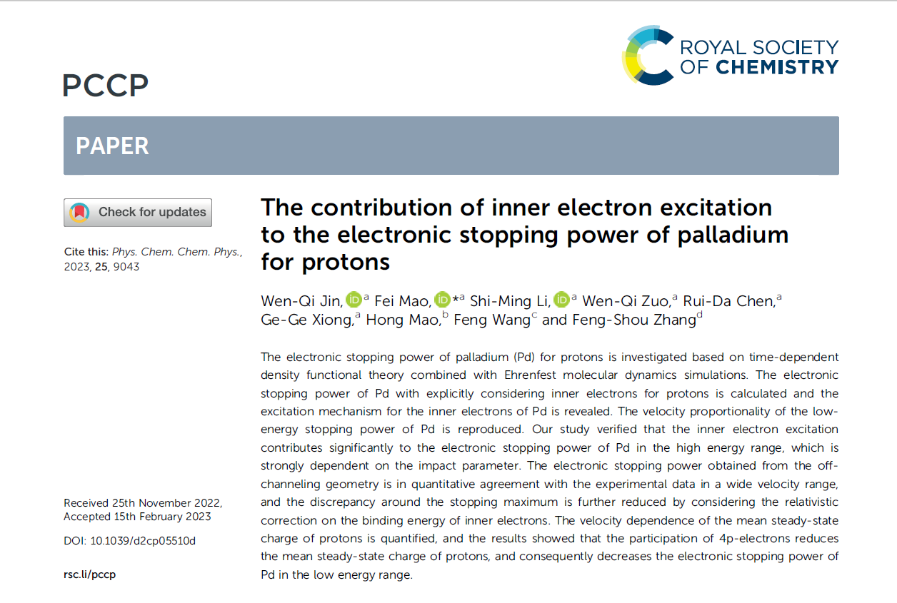 该研究成果以“钯的内层电子激发对质子电子能损的贡献”(The contribution ofinnerelectron excitation totheelectronic stopping power of palladiumfor protons)为题发表在物理化学领域的Top期刊PhysicalChemistry Chemical Physics上(JCR 1区),论文详情请见Phys. Chem. Chem. Phys.25,9043(2023)。该工作得到了审稿人的高度认可,并称这个工作“This is an interesting, timely, and well executed study which makes important contributions to the field of electronic stopping power in materials(这是一个令人感兴趣、及时且执行良好的工作,它对材料的电子阻止本领研究领域做出了重要贡献)”。因此,该论文入选2023年Phys. Chem. Chem. Phys.第13期的封面文章。论文链接:https://doi.org/10.1039/D2CP05510D。