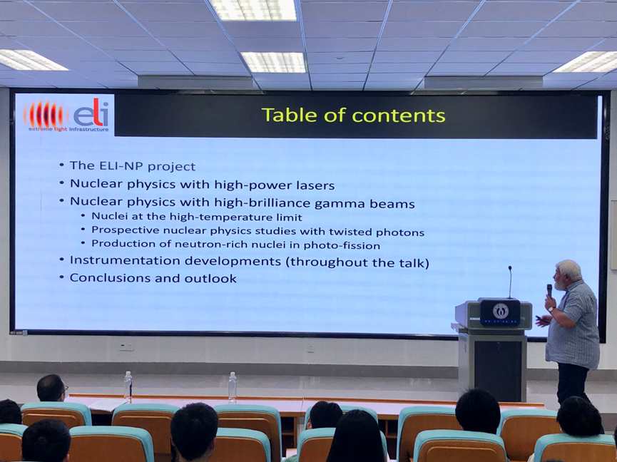 报告会上,Balabanski教授简要回顾了国际上准单色伽光源装置的研发现状,详细介绍了位于罗马尼亚布加勒斯特的ELI-NP项目,重点阐述了高功率激光和高亮度伽马光驱动的核物理研究进展,包括高温极端下的原子核结构和性质、轨道角动量伽马光驱动的核物理研究前景、基于光致裂变的丰中子奇特核产生。Balabanski教授的报告内容丰富,涵括了(激)光核物理前沿科学知识、高功率激光和准单能伽马光源装置、核物理实验测量仪器研发,以及相关研究领域的热点和难点。Balabanski教授的讲解深入浅出,幽默风趣,引发现场师生的深度思考和积极提问。Balabansk教授一一回答了现场师生的问题,报告会在愉快祥和的氛围中落下了帷幕。