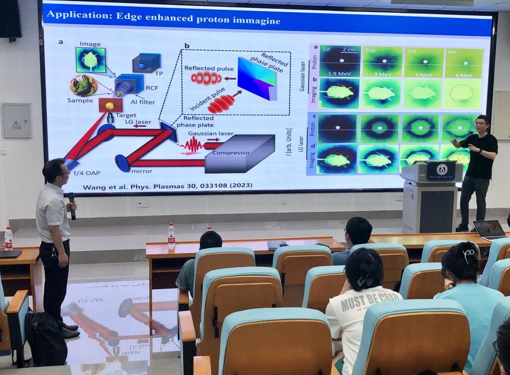 报告会上,王文鹏研究员介绍了中国科学院上海光学精密机械研究所的10 PW超强超短激光装置—羲和(SULF),回顾了研究团队在超强涡旋激光驱动新型光镊方面的理论和实验进展,以及讲解了超相对论拉盖尔—高斯(LG)激光的应用研究,包括LG激光驱动的准直质子加速和边缘增强质子显像。