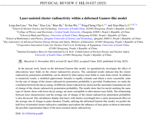 近日,我院李小华教授课题组的硕士研究生廖堎君在国际物理学权威期刊《Physical Review C》(中科院二区,IF 3.4)上发表题为“Laser-assisted cluster radioactivity within a deformed Gamow-like model”的学术论文。 《Physical Review C》是核物理学领域公认的TOP期刊。