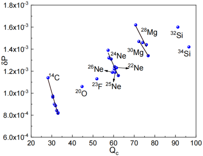 上图:不同结团放射性核的穿透概率变化率与其对应的衰变能之间的关系图