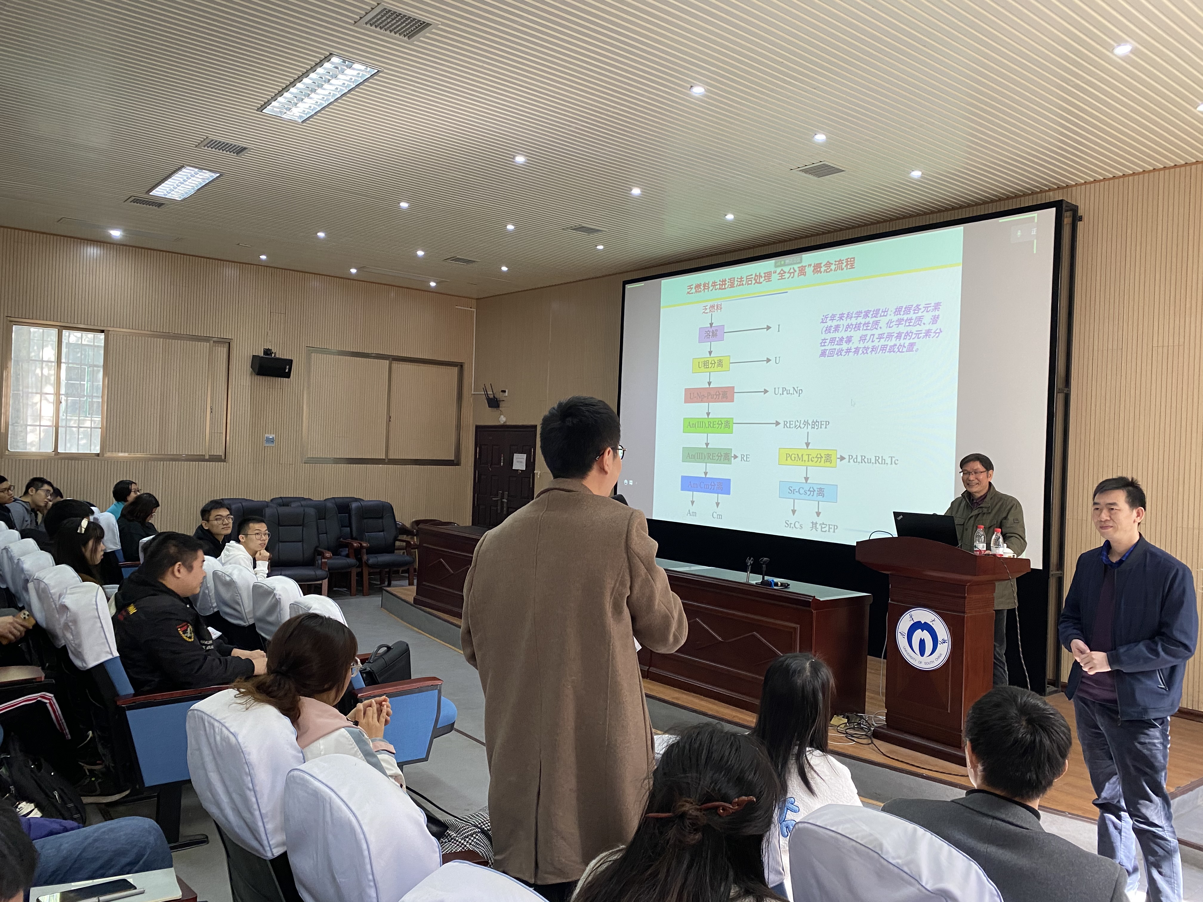 韦悦周教授首先从乏燃料的特征及循环利用的意义出发,简要介绍了现行的工业化后处理技术体系PUREX流程,并指出目前在燃料后处理部分中存在的不足。随后进一步介绍了为实现核裂变能的可持续发展,国内外在先进核燃料循环尤其是对后处理技术的改进及创新的研发动向。在经过详细的分析、总结及比对后,针对目前乏燃料后处理过程中遇到的关键问题,韦悦周教授详细阐述了其团队多年来开发的基于电解还原和吸附分离相结合的先进乏燃料后处理技术体系。