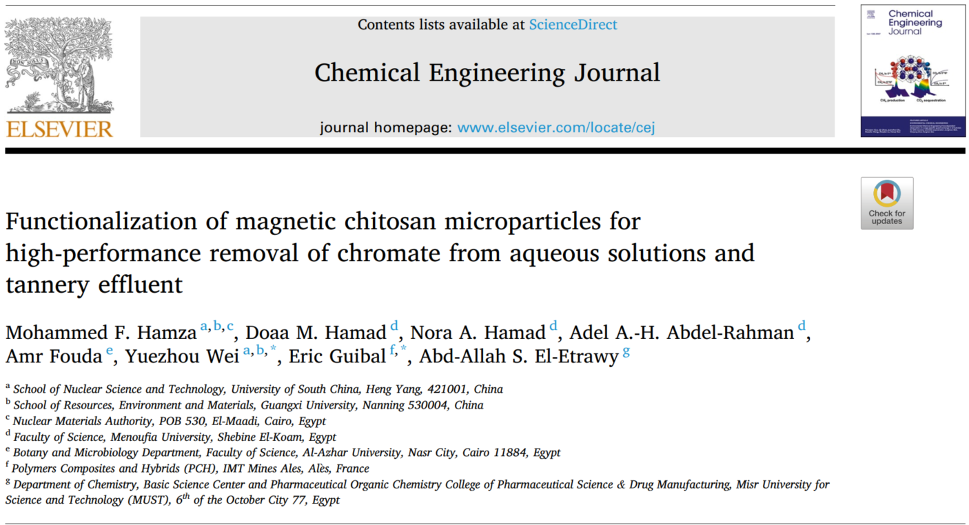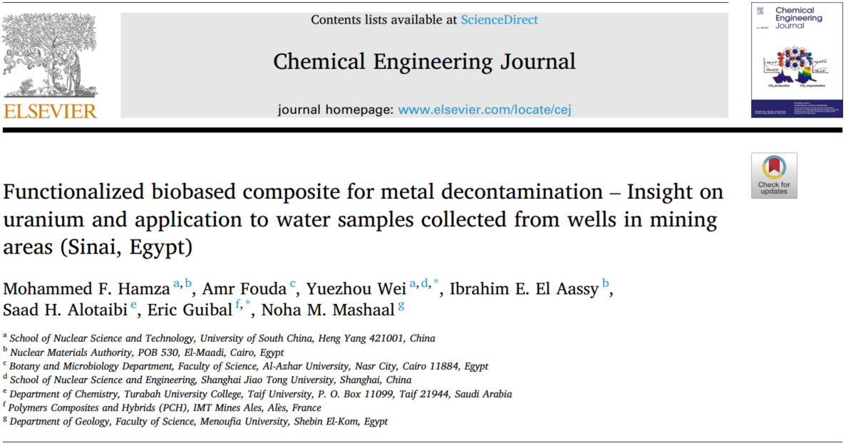 近期,先进核燃料循环化工研究中心负责人韦悦周教授团队与埃及国家核材料机构(NMA)围绕矿产资源开发利用等工业活动引发的放射性及重金属污染治理的合作研究取得了重要进展,3篇高水平学术论文相继发表在化工及核工程领域TOP期刊上。其中题为“Functionalized Biobased composite for Metal Decontamination – Insight on Uranium and Application to Water Samples Collected from Wells in Mining Areas (Sinai, Egypt)” 及 “Functionalization of Magnetic Chitosan Microparticles for High-Performance Removal of Chromate from Aqueous Solutions and Tannery Effluent”的两篇论文已被化工类顶级期刊Chemical Engineering Journal(中科院一区,IF:13.273)在线发表,另一篇题为“Effect of Bi‑functionalization Silica Micro Beads on Uranium Adsorption from Synthetic and Washing Pregnant Uranyl Solutions”的论文发表在Journal of Radioanalytical and Nuclear Chemistry期刊上。3篇论文均以伟的国际1946bv为第一单位,NMA的 M. F. Hamza教授(伟的国际1946bv特聘研究员)为第一作者,韦悦周教授为通讯作者。