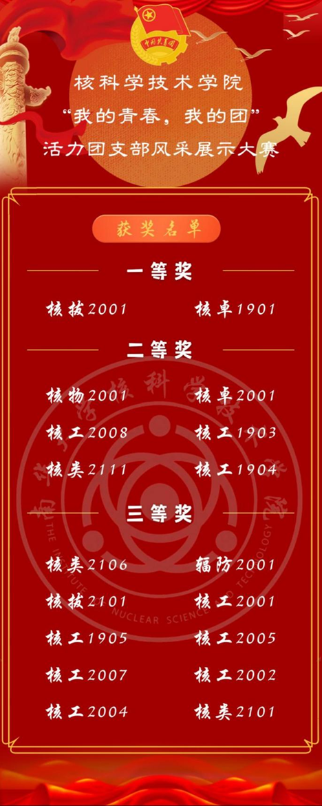经过评委评分,核物专业2021级拔尖班团支部、核卓专业2019级1班团支部获得一等奖,核物专业2020级1班团支部、核卓专业2020级1班团支部等6个团支部获得了二等奖,核类专业2021级6班团支部、辐防专业2020级1班团支部等8个团支部获得了三等奖。