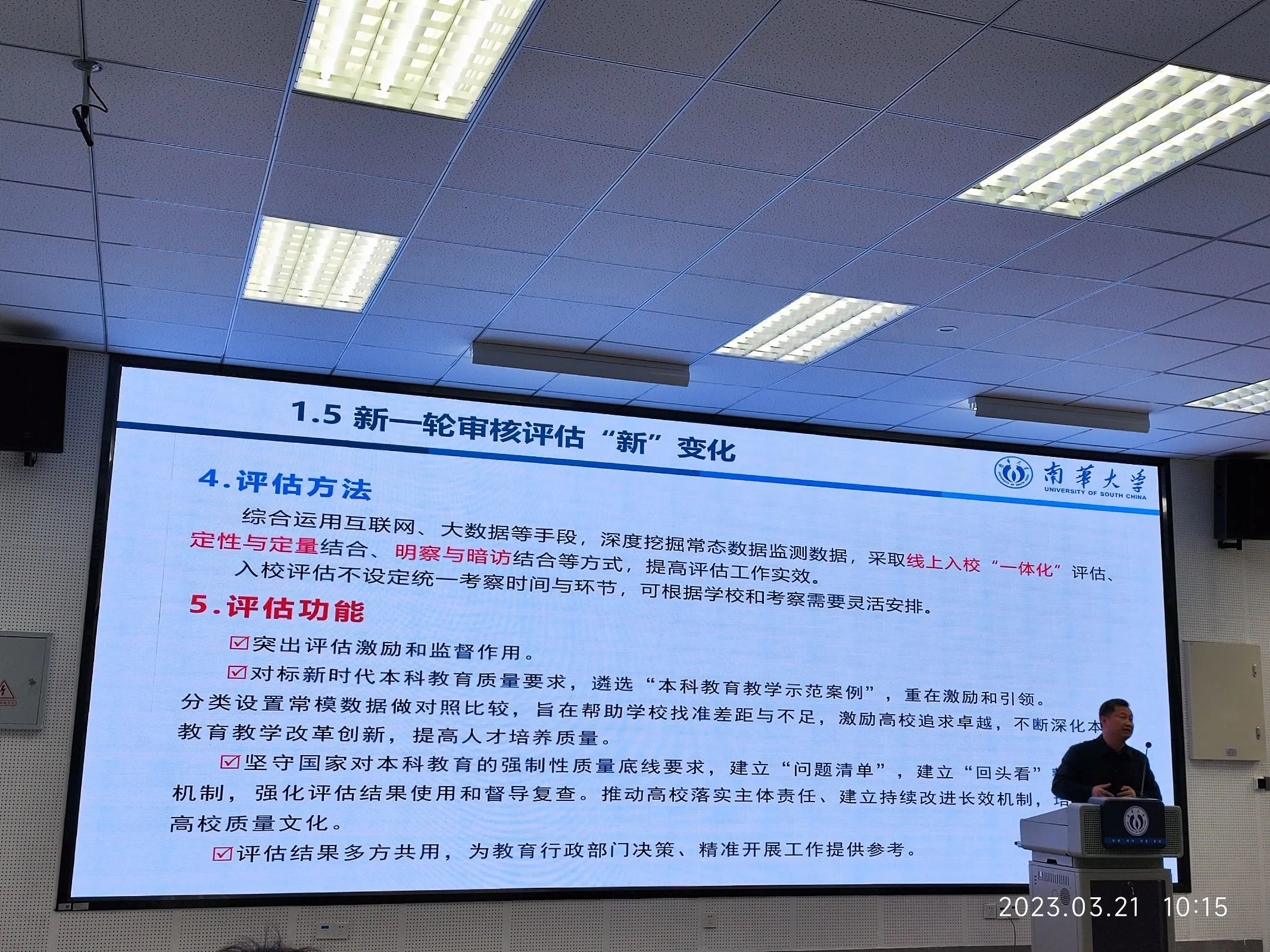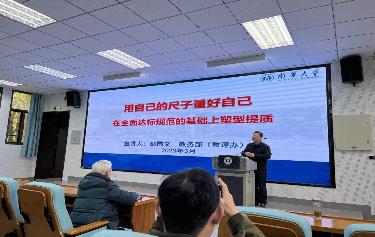 为使我院教职工进一步深刻认识审核评估对学校改革与发展的重要意义,对改进教育教学工作、提升教育教学质量的作用;全面理解审核评估方案的新变化、新理念,准确把握自评自建工作的任务与要求。扎实推进审核评估各项工作,全面落实立德树人根本任务。3月21日上午10:00,教务部部长彭国文在核学楼225报告厅,面向bv1946伟德国际始于英国各系室主任、支部书记以及部分教师代表做了题为“用自己的尺子量好自己--在全面达标规范的基础上塑型提质”的本科教育教学审核评估专题报告。本次专题报告由学院党委书记赵立宏主持。