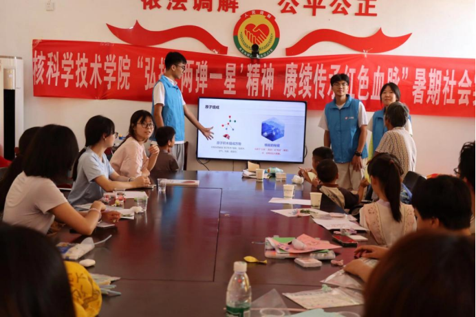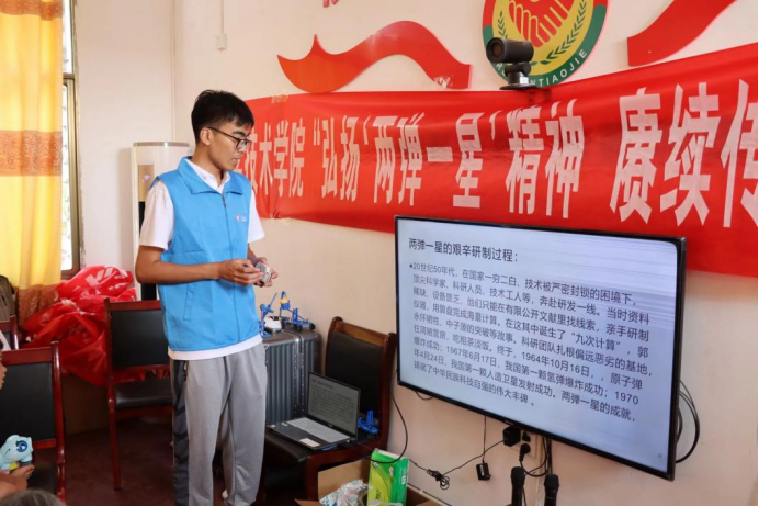7月8日上午,伟的国际1946bv“两弹一星”精神研究会志愿服务团联合bv1946伟德国际始于英国“核韵青春,志愿同心”服务团、进安仁县永乐江镇长潭村,开展“两弹一星”精神宣讲与核科普活动。